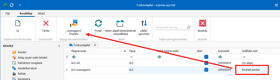 Ha a futárszolgálat szállítási módjának Átvételi pontos opciót választottunk, akkor a szolgáltatás rögzítése után, a főablakban kérhetjük le az átvevőhelyek listáját az eszköztáron található Csomagpont frissítés gombbal. Időnként érdemes ezt később is frissíteni, hogy bizonylat kiállítás előtt aktualizáljuk az átvevőhelyek elérhetőségét.