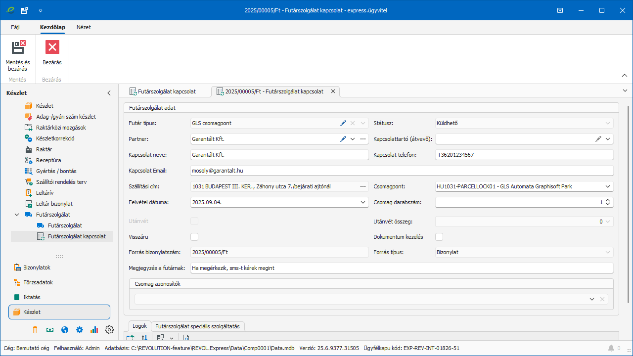 A bizonylat rögzítése után a megadott adatok alapján elkezdhetjük a futárszolgálattal való kapcsolatfelvételt a következő pontban.