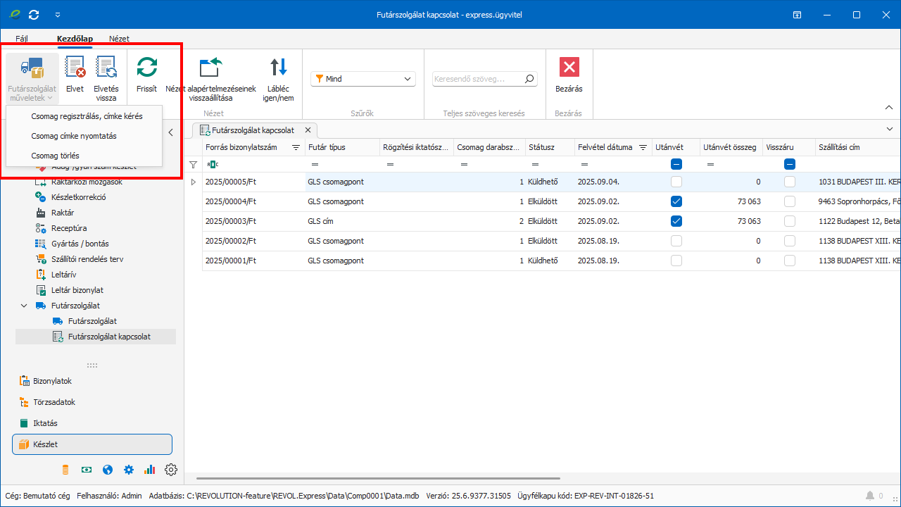 A futár megrendelését, címkék lekérését, valamint nyomtatását a Készlet csoportban található, Futárszolgálat kategóriában lévő Futárszolgálat kapcsolatban végezhetjük el. Itt látható az összes olyan megrendelés, amit bizonylatokhoz rögzítettünk.