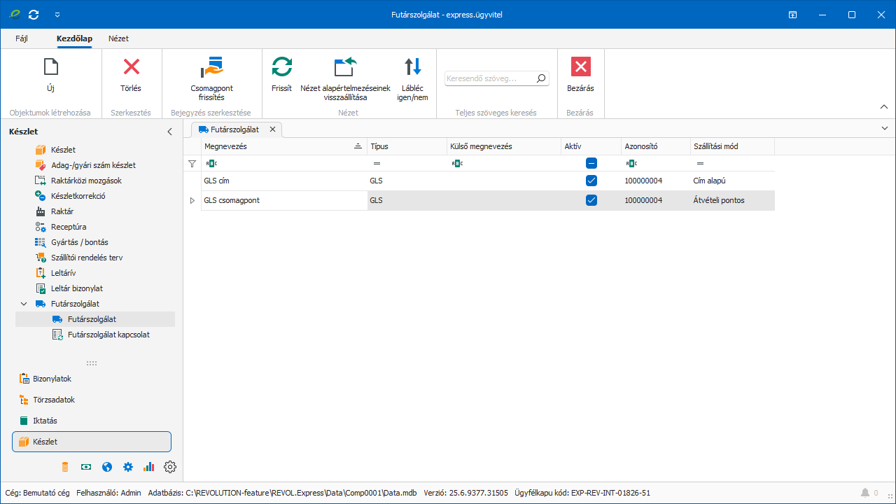 A legelső használat előtt rögzítenünk kell azokat a futárszolgálatokat, amelyekkel csomagot szeretnénk küldeni a későbbiekben. Ezt a Készlet csoportban lévő, Futárszolgálat kategóriában található Futárszolgálat menüben tehetjük meg.