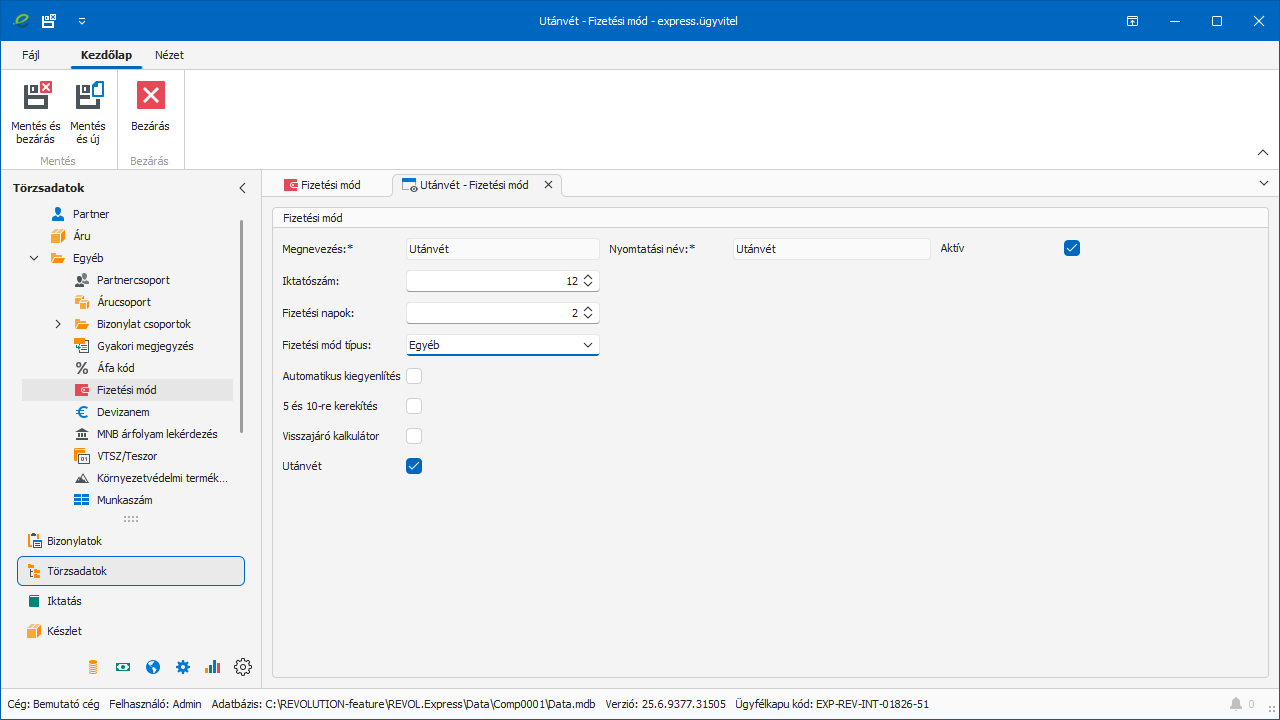 Ha Utánvétes szállítást is szeretnénk használni, ezt a Törzsadatok csoport, Egyéb kategóriában lévő Fizetési módoknál állíthatjuk be. Ha nem szeretnénk a meglévő fizetési módjainkat módosítani, érdemes felvenni egy újat az eszköztáron lévő Új (fehér lap) gombbal. A megjelenő lapon a Megnevezés mezőbe írjuk be az Utánvét nevet, adjuk meg a Fizetési napok számát (ha utalásnak vesszük), válasszuk ki, milyen Fizetési mód típusnak felel meg könyvelésileg (Készpénz, Átutalás, Bankkártya vagy Egyéb), az Automatikus kiegyenlítés opciót jelöljük be, ha nem átutalási módot választottunk, valamint az Utánvét opciót adjuk meg.