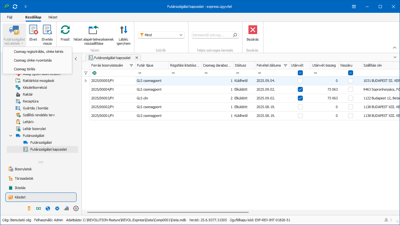 A bizonylatok kiállítása során megadott adatok alapján kerülnek ide a futárszolgálattal kapcsolatos információk, melyek alapján megtörténik majd a kiszállítás.