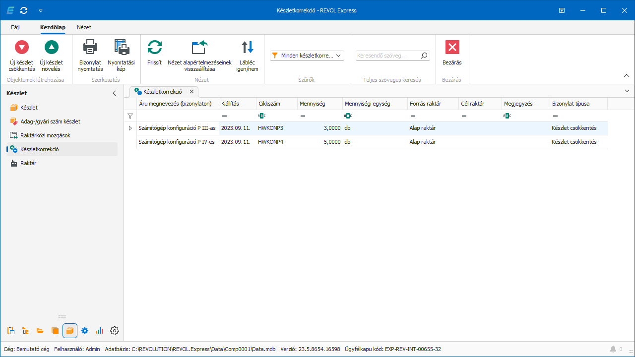 A Készlet csoportban lévő Készletkorrekció funkcióra kattintva egy általános listás áttekintő ablak jelenik meg, amely testre szabható, exportálható, nyomtatható az eszköztárakon lévő gombok, valamint a jobb egérkattintásra megjelenő menük segítségével.