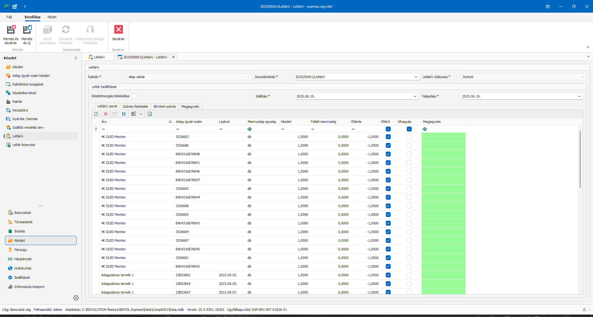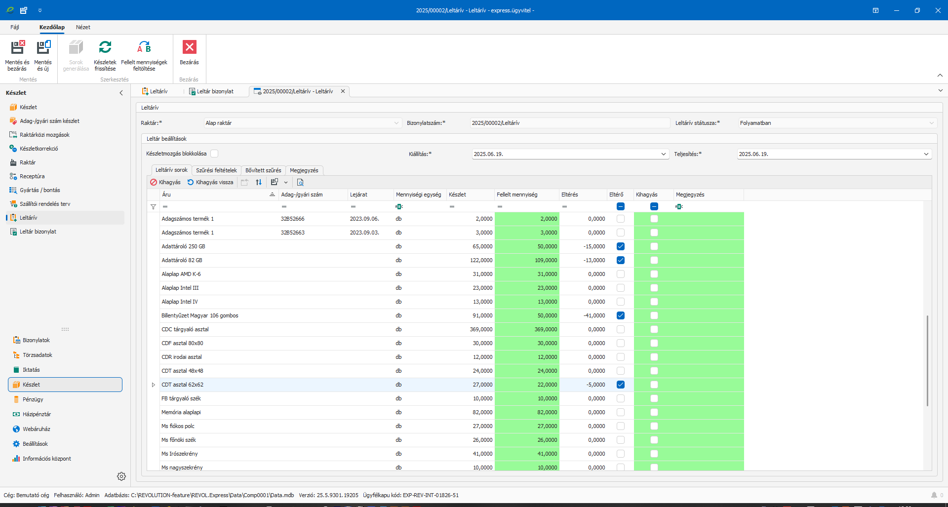 •Fellelt mennyiségek frissítése: amennyiben feltételezzük, hogy a készletünk stimmel, ennek a gombnak a megnyomásával kitölthetjük előre a Fellelt mennyiség oszlop értékeit a jelenlegi készlet mennyiségével, és ezek után már csak az eltérő készletmennyiségeket kell megadni.