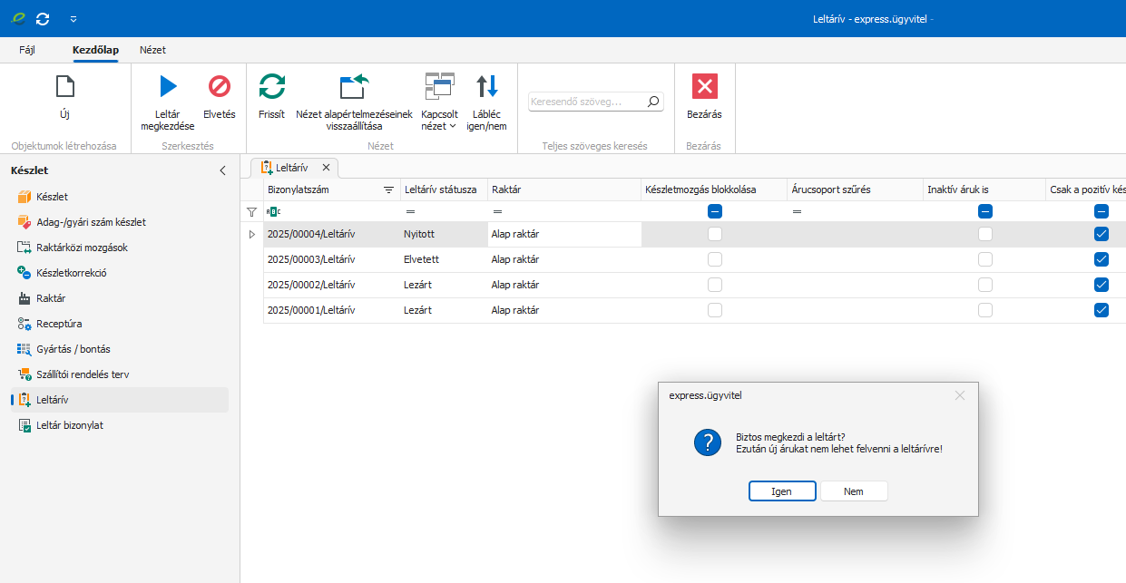 •Leltár megkezdése: ha már összeállítottuk a leltározáshoz szükséges termékeket, és a Leltárívünk Nyitott állapotban van, ezzel indíthatjuk el a leltározást. A program figyelmeztet, hogy a leltár megkezdése után már nem vehetünk fel új termékeket a leltárívre! A gomb megnyomása után a leltárívünk státusza Folyamatban állapotra vált.