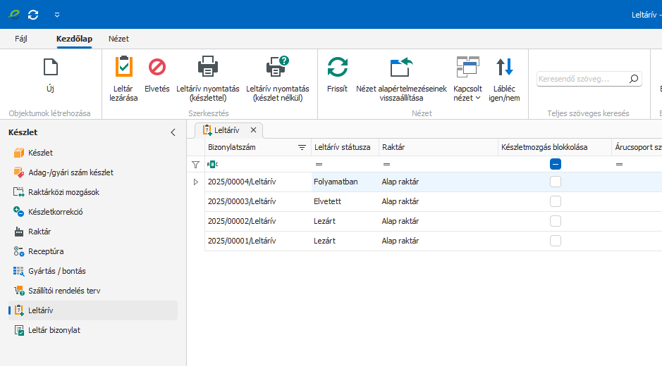 Fontos: a Leltárív a mentéskor nem kerül automatikusan lezárásra, tehát nem kapja meg a Lezárt státuszt mindaddig, amíg a Leltárív áttekintőben az eszköztáron meg nem nyomjuk a Leltár lezárása gombot!