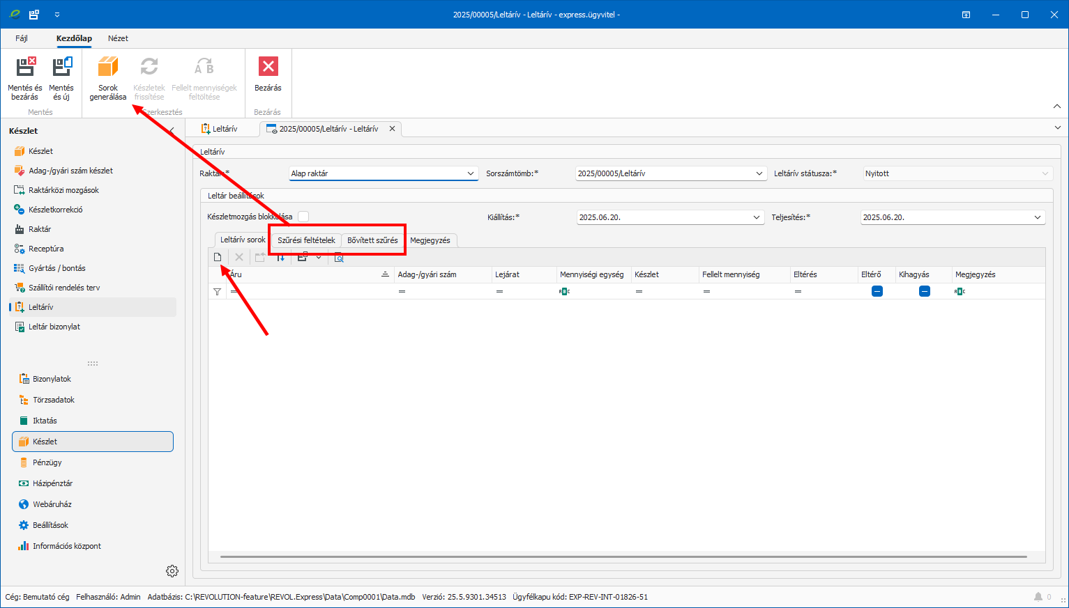 A dátumok megadása után eljutunk a Leltárív sorok fülhöz. Egyesével is felvihetjük a termékeket az Új gomb segítségével, de generálhatjuk is azt. Generálás előtt váltsunk át a Szűrési feltételek fülre, és állítsuk be az ottani paramétereket, ami alapján a listát generáljuk. Haladó felhasználók a Bővített szűrés fülön lévő feltételekkel tovább szűkíthetik a listát.