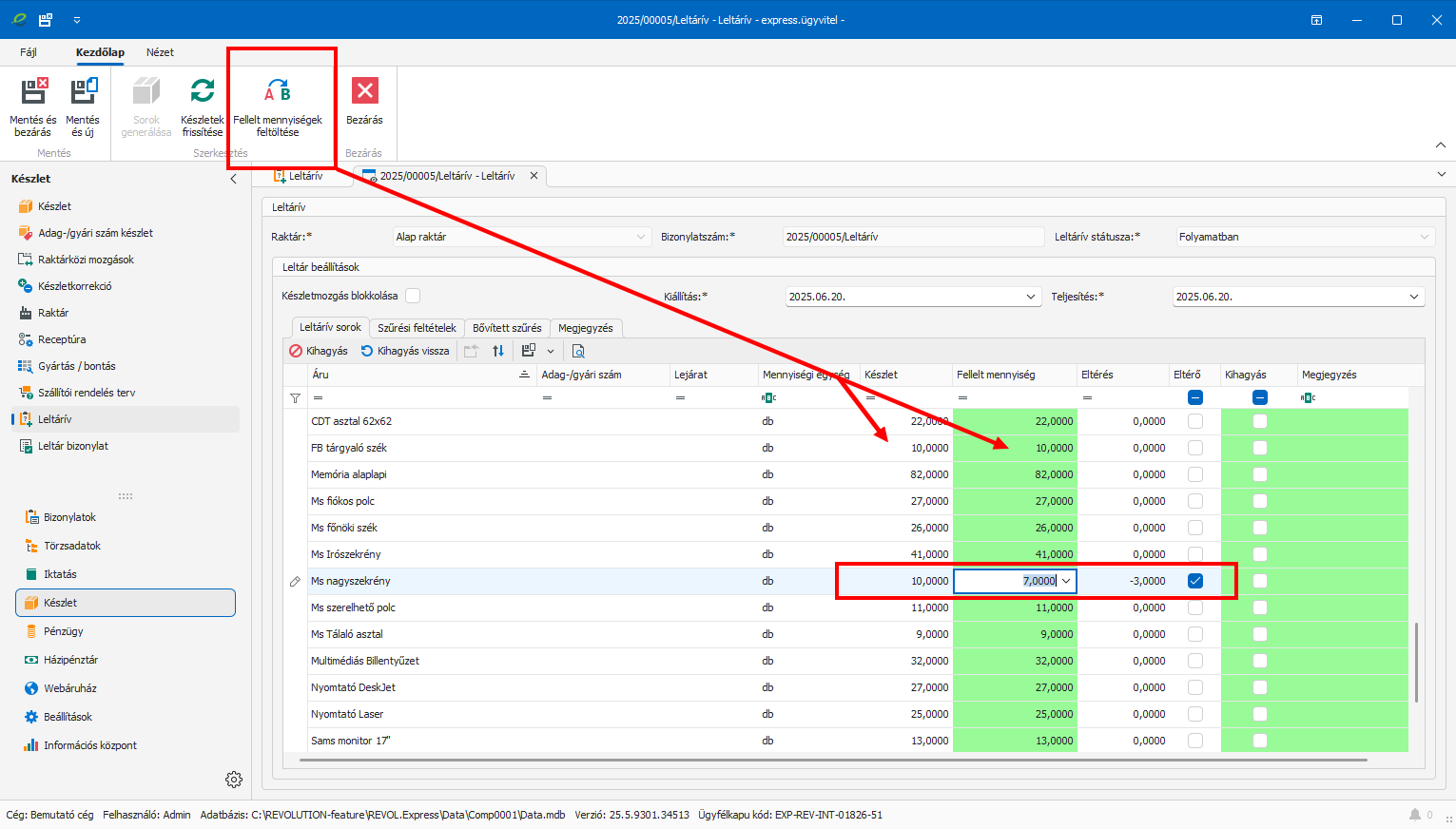 A Fellelt mennyiség oszlop egyik zöld mezőjén duplán kattintva vagy a Szóköz billentyűt leütve szerkeszthetjük a mezőt, beírhatjuk a valós mennyiséget. A mező mellé kattintva vagy Entert ütve rögzítjük a mennyiséget. Amikor a Fellelt mennyiség eltér a Készlet oszlopban lévő mennyiségtől, a program automatikusan kiszámolja a különbséget, és beírja az Eltérés oszlopba, valamint az Eltérő oszlopban jelzi is.
