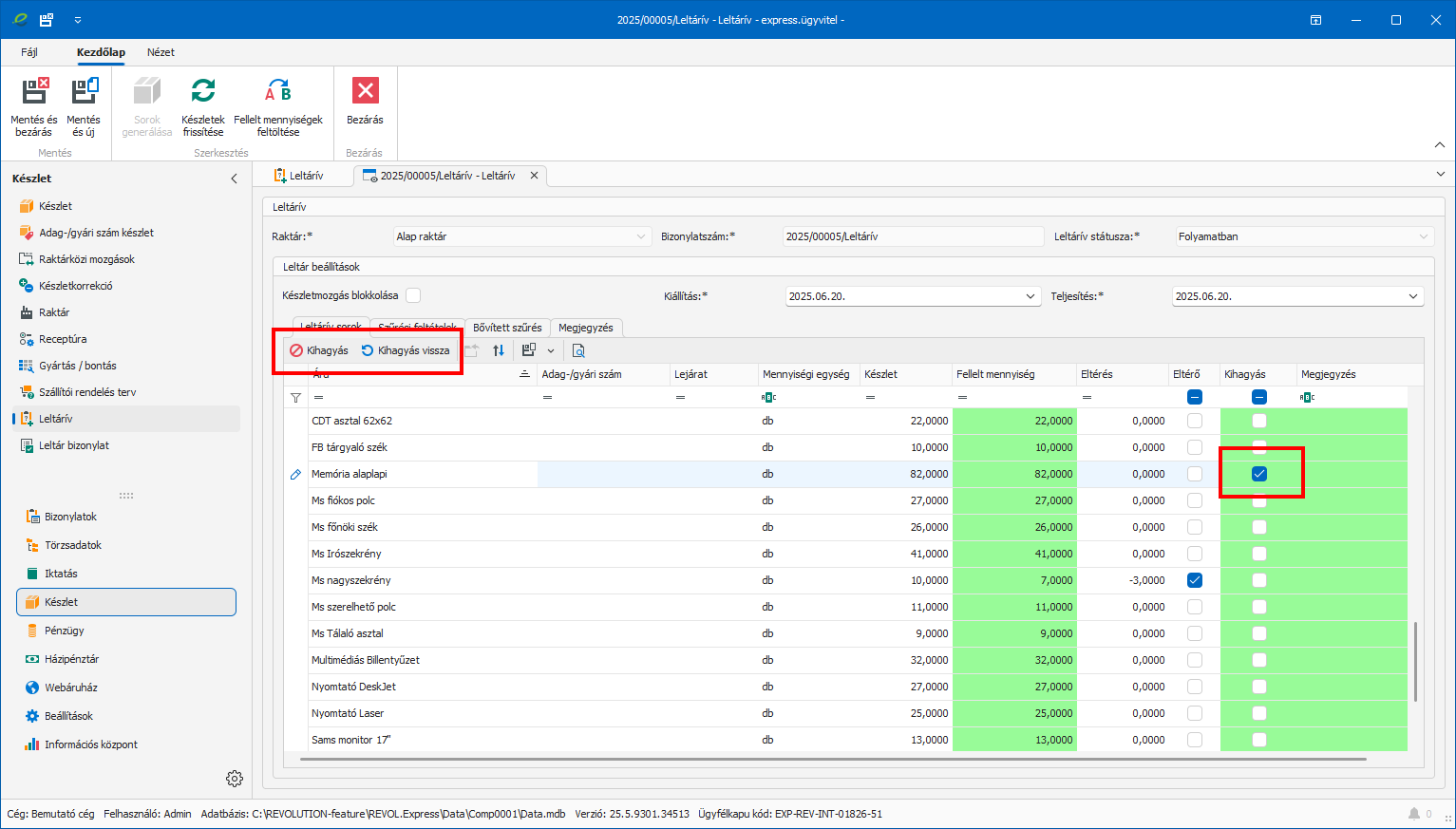 Ha valamelyik tételt nem szeretnénk leltározni, akkor a Kihagyás opciókat választhatjuk: vagy a pipát közvetlenül, dupla kattintással bejelölhetjük, vagy a Kihagyás/Kihagyás vissza gombokat is választhatjuk.