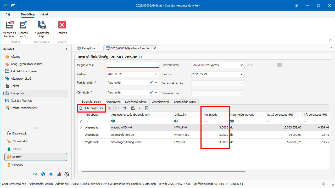 4.Megjelenik a gyártás vagy a bontás ablaka, ahol tetszés szerint módosíthatunk, illetve új tételeket is vehetünk fel.